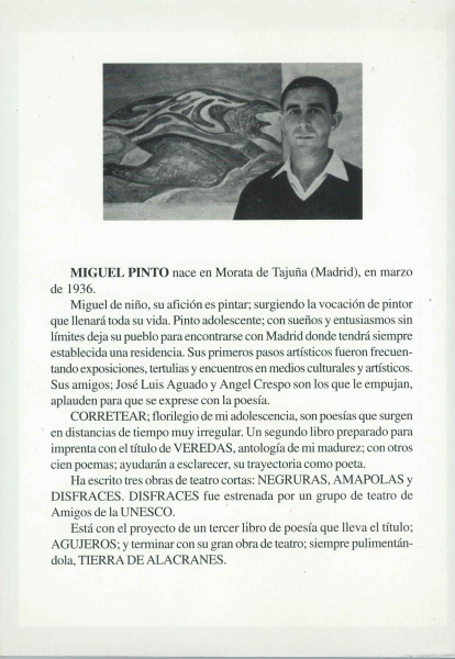 Los primeros pasos artísticos de Miguel Pinto fueron frecuentando exposiciones, tertulias y encuentros en medios culturales y artísticos. Sus amigos; José Luis Aguado y Angel Crespo son los que le empujan, aplauden para que se exprese con la poesía.